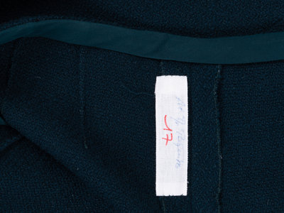 The pants contain a label featuring the name Paquito, hand-written in ink. Paquito Sala, an expert tailor at Chanel, worked under Pierre Balmain until the couturier’s death in 1982. Lagerfeld brought him to Chanel the following year. The German couturier and the Spanish tailor first met in 1954, when Sala worked as Balmain’s assistant. Thanks to the acumen that distinguished him, Lagerfeld immediately recognized Sala’s outstanding skill and brought him to Chanel as the head of the atelier tailleur nearly thirty years later. Lagerfeld would deliver sketches, and Sala oversaw the creation of countless haute couture creations during his tenure with the house.