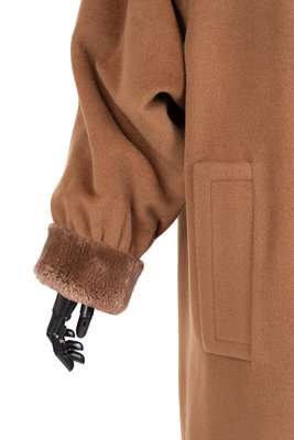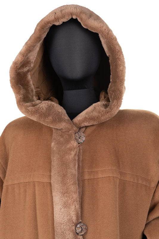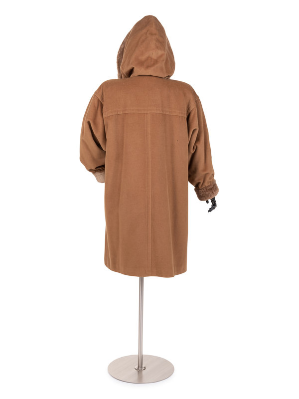 Camel wool/cashmere blend hooded oversized coat trimmed with light shearling trim and lining, padded shoulders into full gathered sleeves, hip welt pockets, and front button closure.