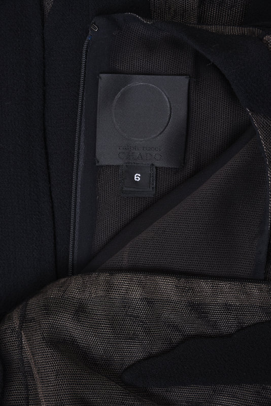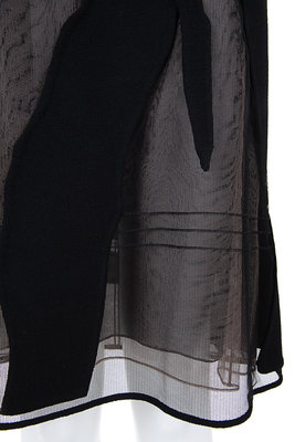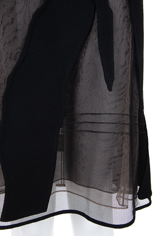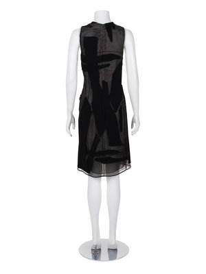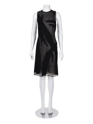 Black wool and silk sleeveless sheath dress on black and cream netting with wool patches and center back zipper closure.