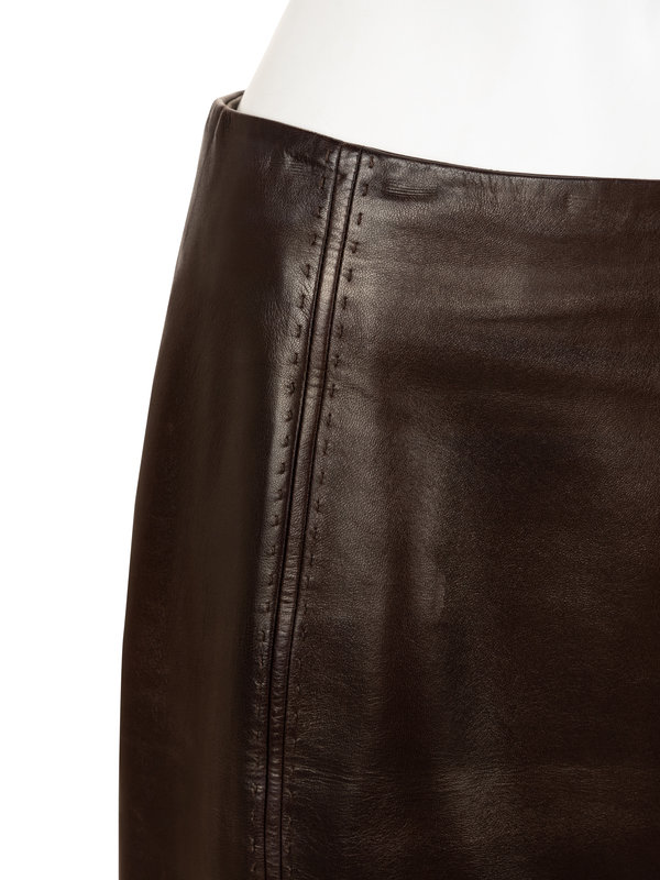 Chocolate brown leather straight fit skirt with left side zipper closure.