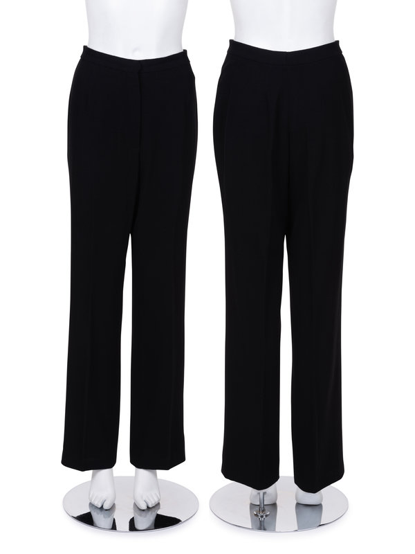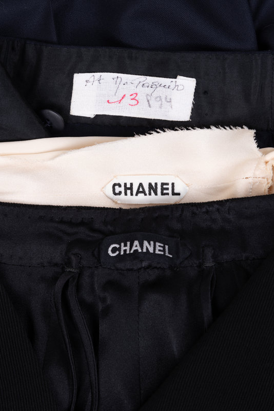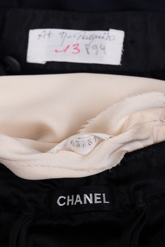 One of the pair of pants was made by Paquito Sala and features a label with his name, hand-written in ink. Paquito Sala, an expert tailor at Chanel, worked under Pierre Balmain until the couturier’s death in 1982. Lagerfeld brought him to Chanel the following year. The German couturier and the Spanish tailor first met in 1954, when Sala worked as Balmain’s assistant. Thanks to the acumen that distinguished him, Lagerfeld immediately recognized Sala’s outstanding skill and brought him to Chanel as the head of the atelier tailleur nearly thirty years later. Lagerfeld would deliver sketches, and Sala oversaw the creation of countless haute couture creations during his tenure with the house.