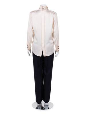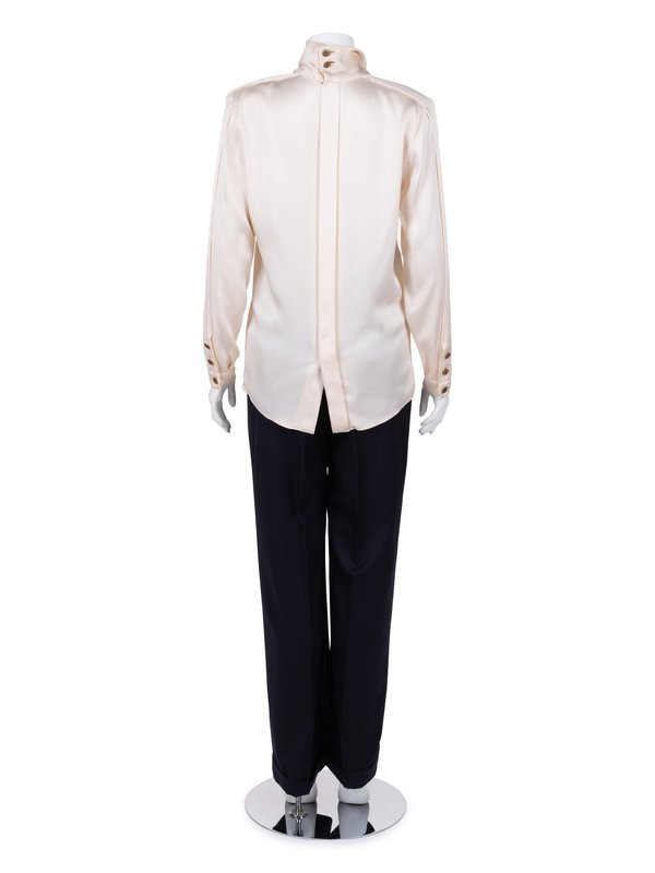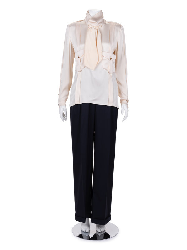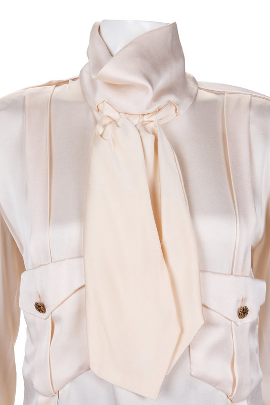 Haute Couture ivory silk satin long sleeve top with stitched knotted neck tie, front chest pockets over pleated bodice, long sleeves with barrel cuffs, and center back hidden button closure.