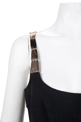 Black wool crepe sleeveless dress with deep neckline, gold metallic leather pieced straps and panels inset at waist, full skirt, and back zipper closure.