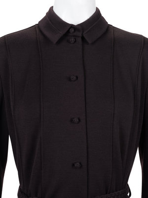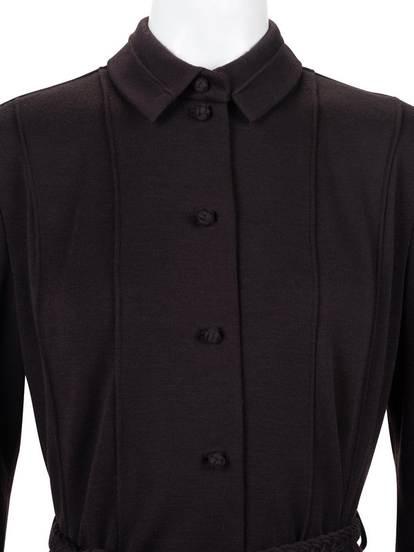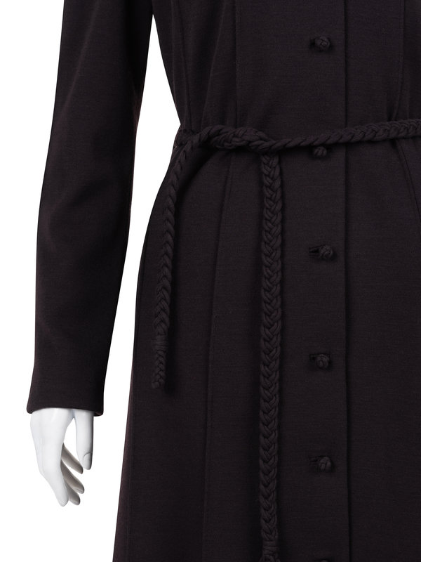 Burgundy wool jersey knit shirt dress with convertible collar, eased in long sleeves, paneled skirt, and front button closure with matching braided tie belt.