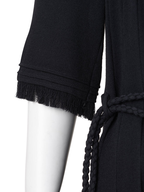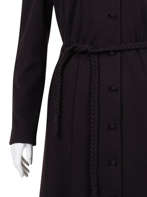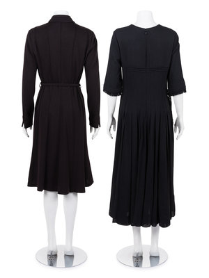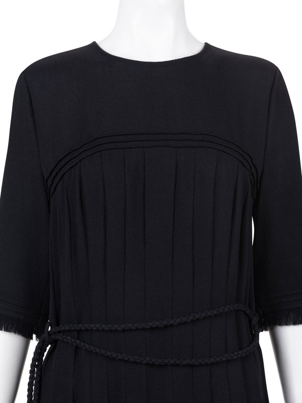 Black felted wool pin tucked shift dress with jewel neckline, 3/4 flared sleeves, full skirt, and back zipper closure with matching braided tie belt.