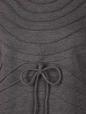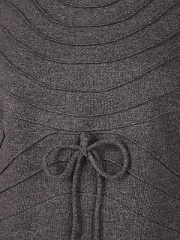 Warm gray wool knit long sleeve dress with pin tuck detailing throughout, jewel neckline, long sleeves, tied cord bow at the chest, and back zipper closure.
