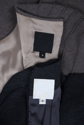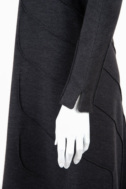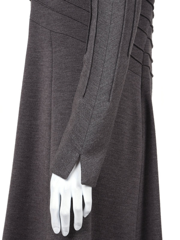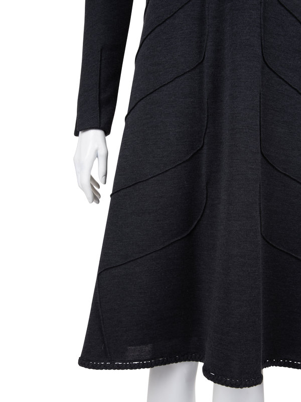 Dark gray wool knit long sleeve dress with pin tuck detailing throughout, jewel neckline, long sleeves, flared skirt with braided hem, and back zipper closure.