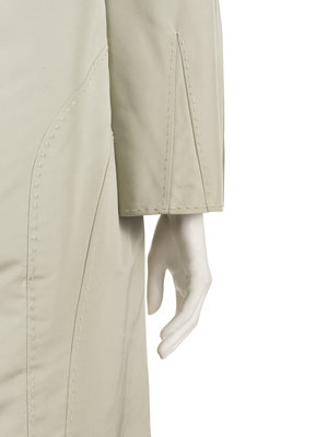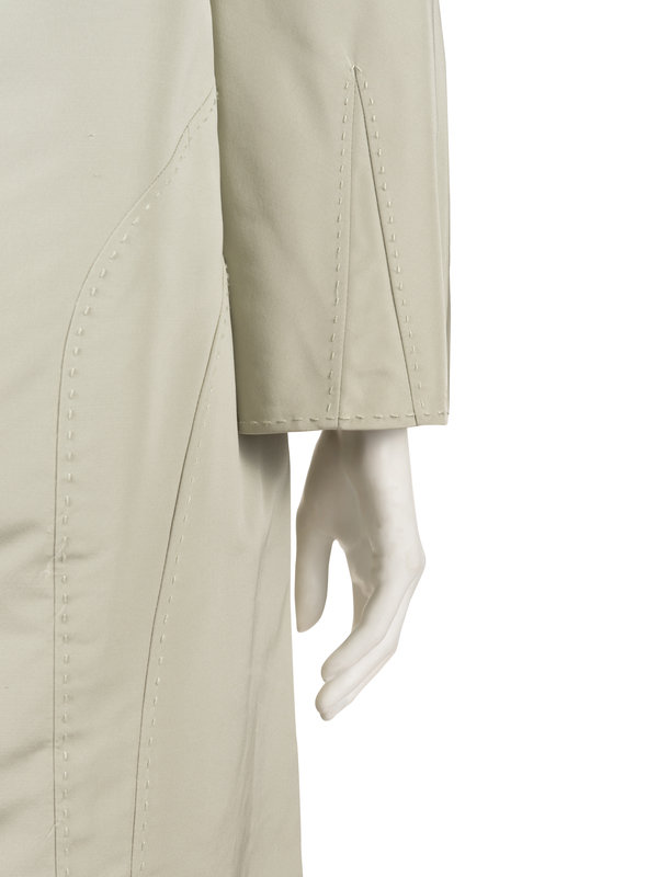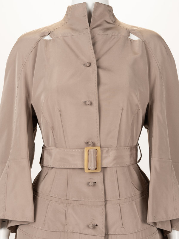 Beige silk taffeta belted jacket with hand stitched detailing, built up neckline, flared hem raglan long sleeves, inset pieces at upper chest, full skirt, and front button closure with buckled belt.