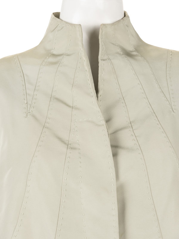 Pale green silk taffeta jacket with hand stitched detailing, a built up neckline, raglan long sleeves, and front button closure.