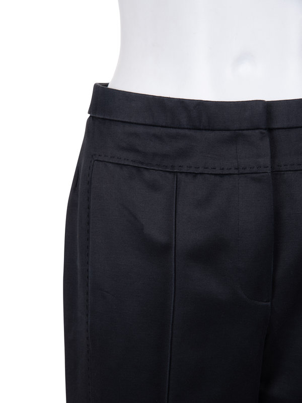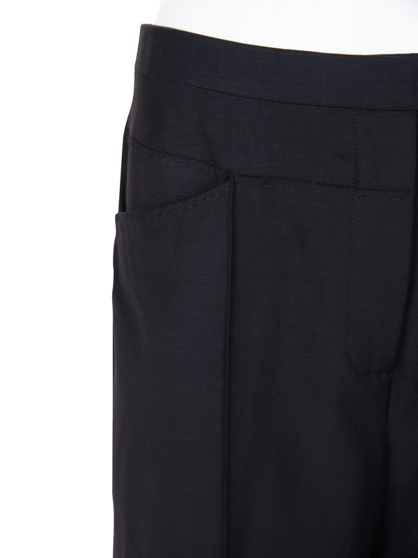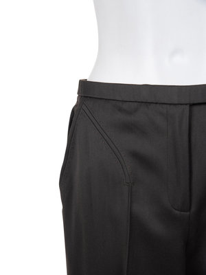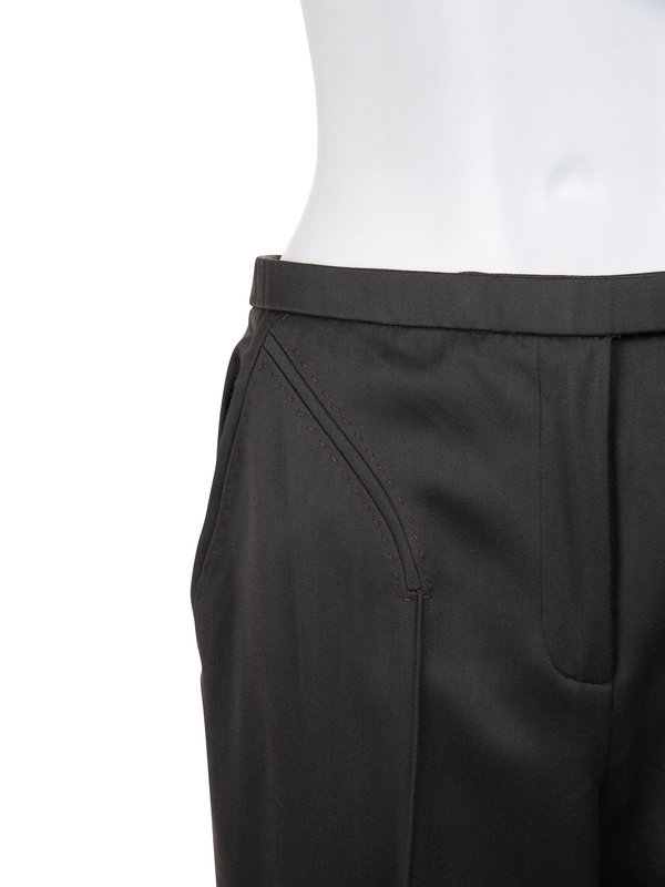 Black wool pants with decorative top stitching, two back buttoned pockets, and front zipper closure.