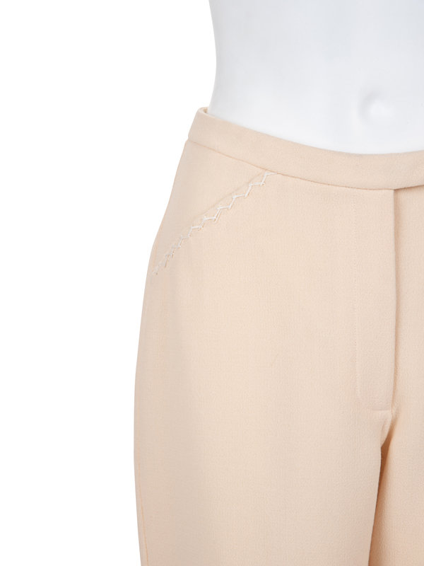 Cream wool pants with zigzag stitch detail faux pockets on the front, faux double welt pockets on the back, and front zipper closure.