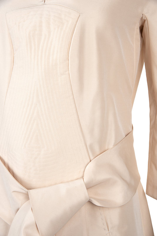 Pale pink, cotton/silk blend taffeta princess seam dress with a quilted front and back panel, 3/4 length sleeves, flared skirt, and back zipper closure with matching taffeta tie sash.