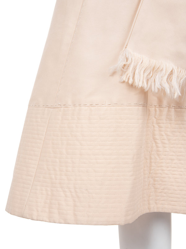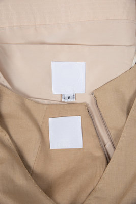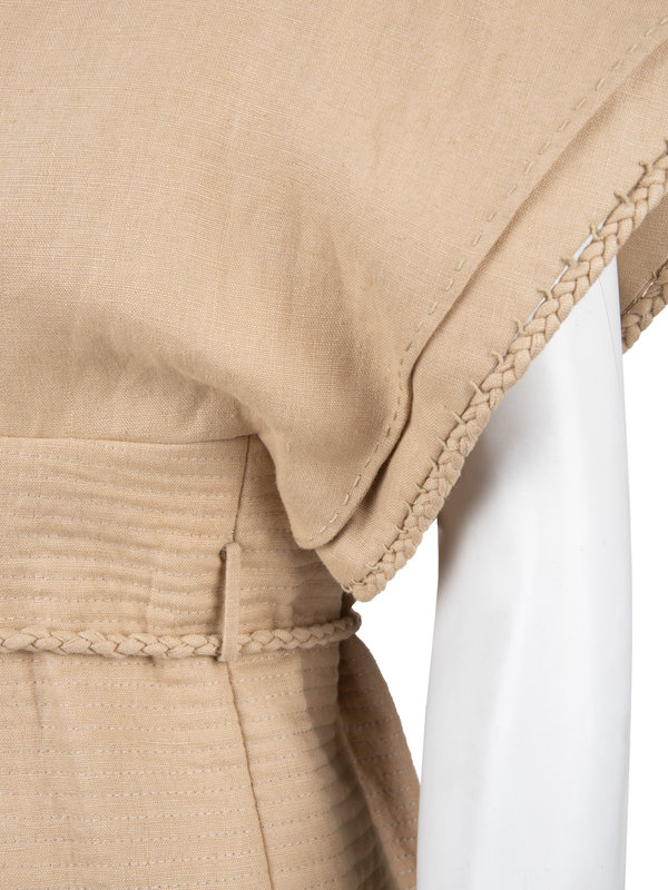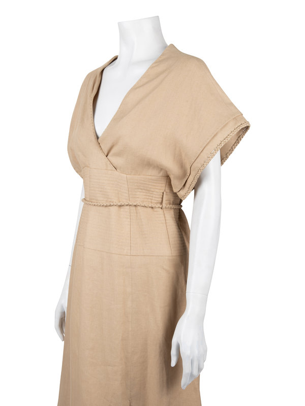 Beige linen wrap dress with draped top, topstitching and pin tuck detailed waist, braided hems, and back zipper closure with matching braided tie belt.