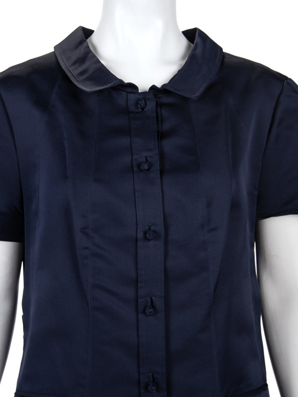 Navy pleated silk A-line shirt dress with a rolled collar, short sleeves, front hip pockets, pleated skirt, and front knotted button closure.