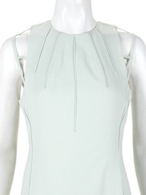 Pale blue wool sleeveless dress with attached shoulder straps, pin tuck detailed jewel neckline, straight fit skirt, and back zipper closure.