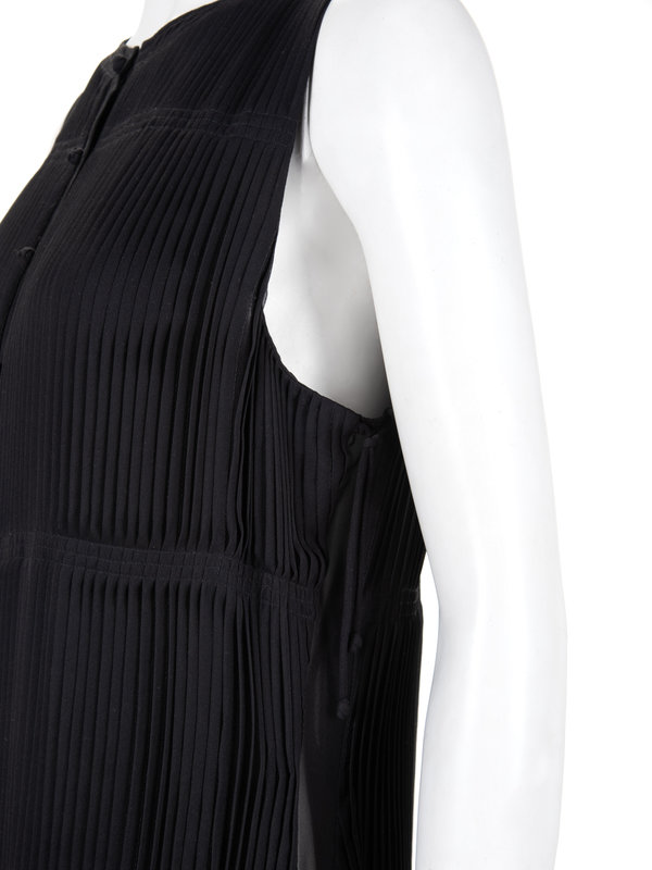 Black silk pleated sleeveless maxi dress with jewel neckline, side cord ties, and front knotted button closure.