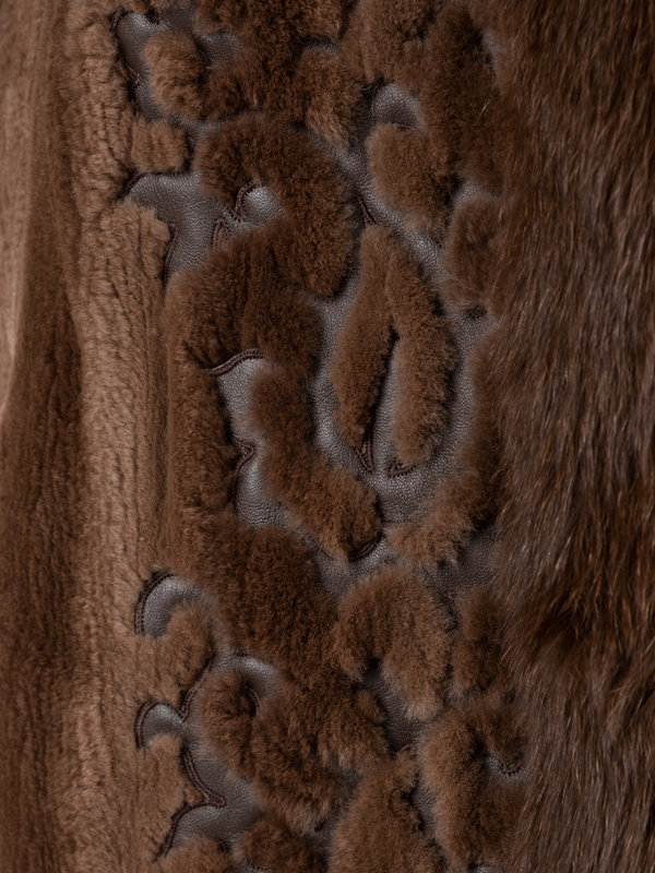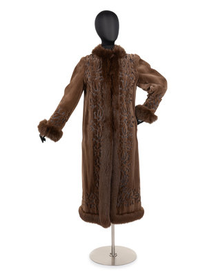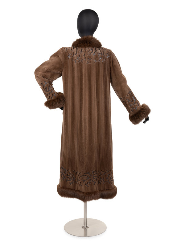 Brown sheared mink fur coat with brown leather appliques at front, neckline, sleeve hems, and hemline, trimmed in brown fox fur, and front hook and eye closure.