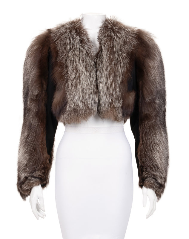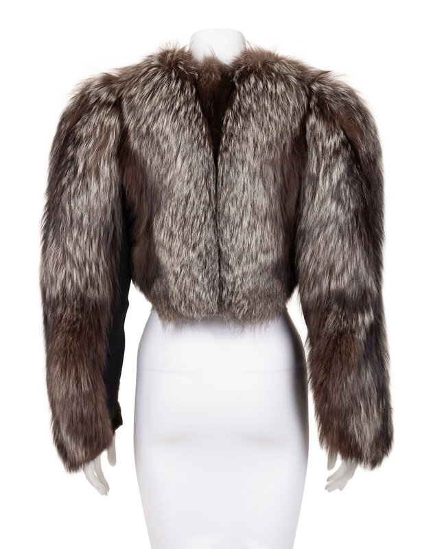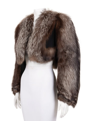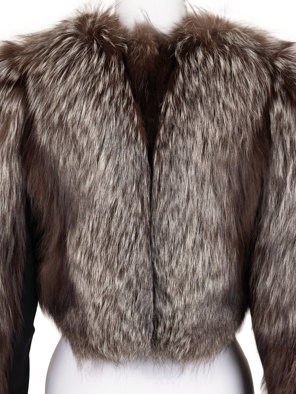 Silver fox fur cropped jacket with black crepe under sleeves and bodice, and open front.