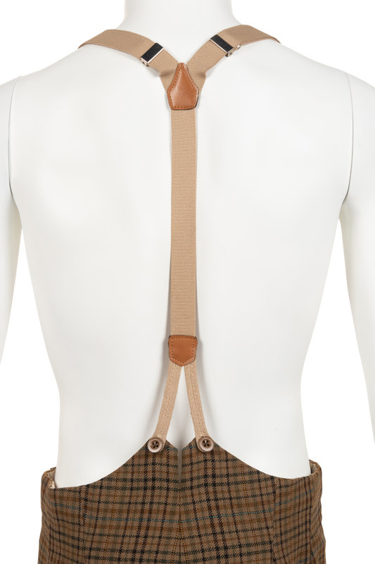Men's wool plaid three piece suit with suspenders including a notched lapel jacket with padded shoulders into long two-piece sleeves, side flap pockets, and front button closure; paired with matching vest with waist welt pockets, back waist cinch, and front button closure; and pleated button fly trousers with suspenders.