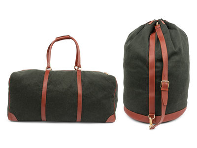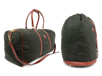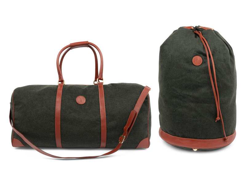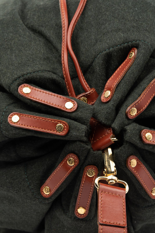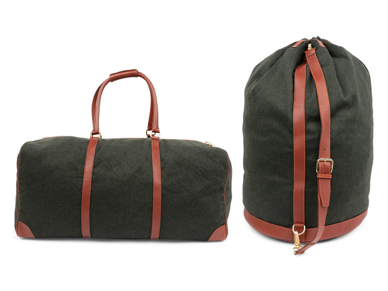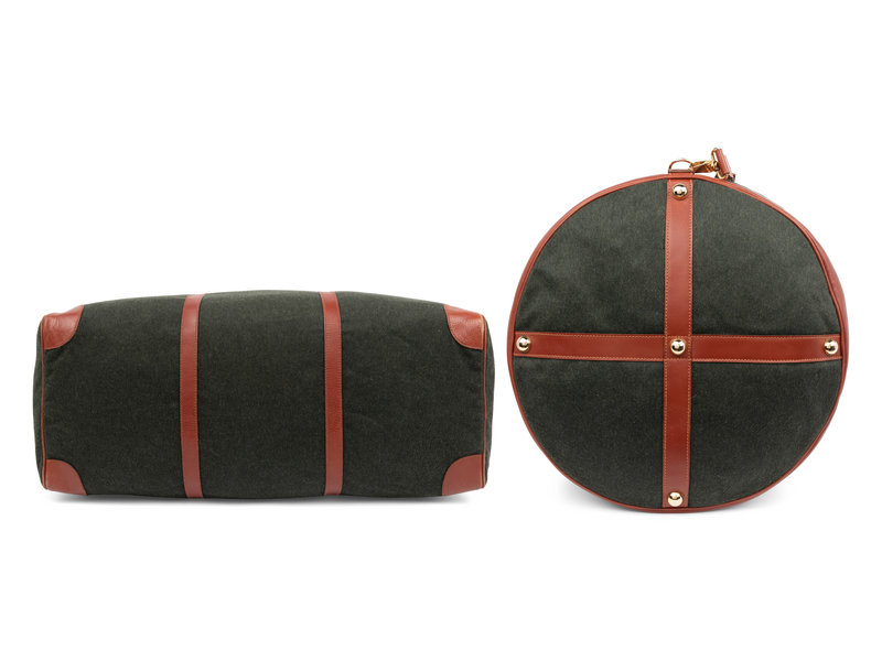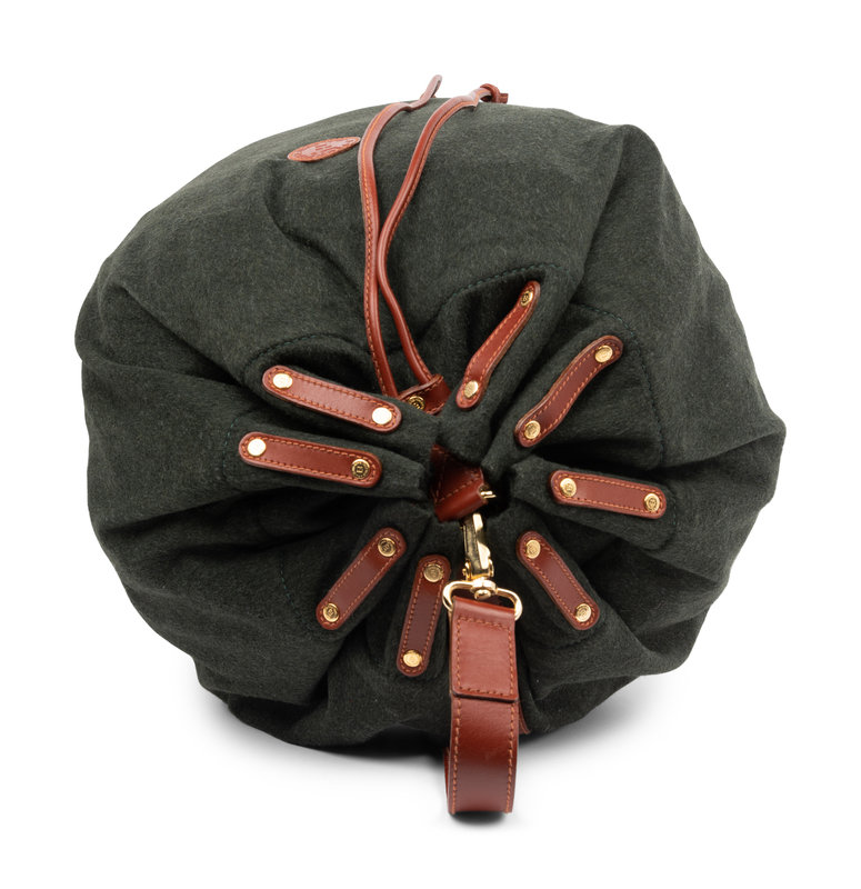Green felted wool standing duffle bag with brown leather trim, interior cinch and buckle clasp closure.