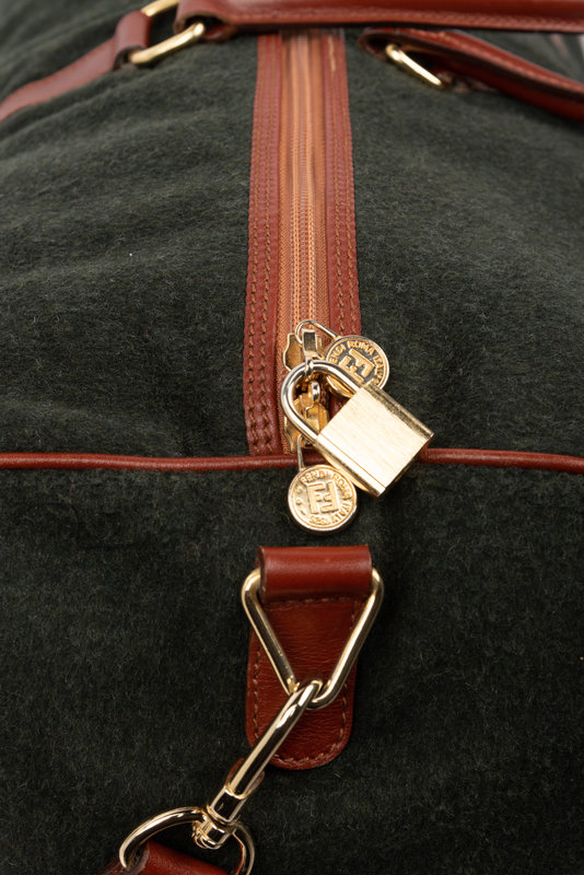 Green felted wool duffle bag with brown leather trim, dual top handles, detachable shoulder strap, and top zipper closure.