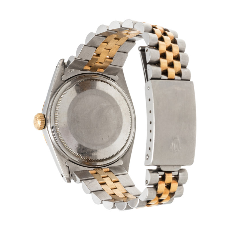34.00 mm case diameter, textured gold dial, applied gold baton numerals, center sweep seconds hand, date aperture at 3 o'clock with magnifier in crystal, self-winding movement, stainless steel and yellow gold Jubilee link bracelet, deployant clasp with Rolex logo. 6 1/2 inches inner circumference.