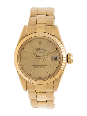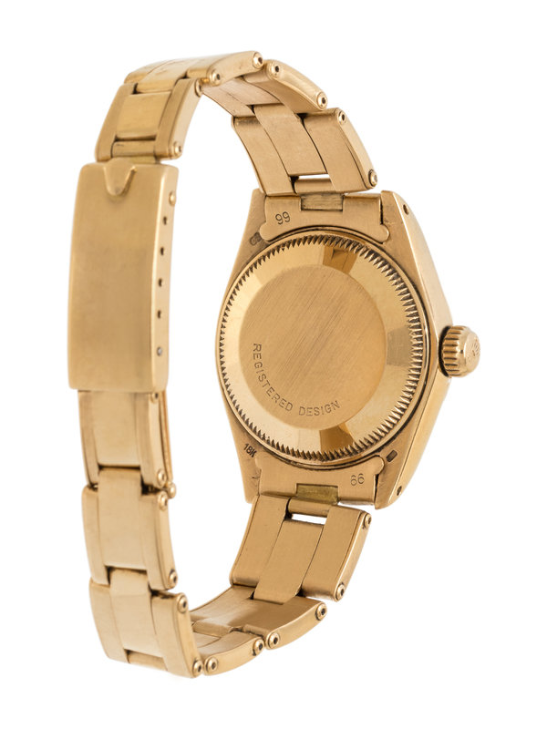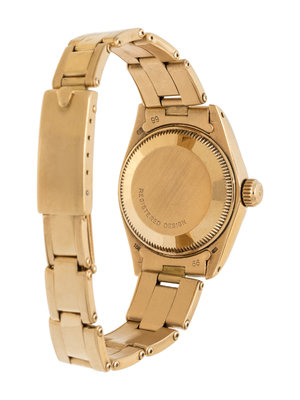 26.00 mm case diameter, matte gold dial, applied gold baton numerals, center sweep seconds hand, date aperture at 3 o'clock with magnifier in crystal, self-winding movement, yellow gold flexible link bracelet, deployant clasp with Rolex logo. 5 3/4 inches inner circumference.