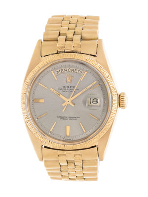 36.00 mm case diameter, matte silvered slate dial, applied yellow gold baton and dagger numerals, bark texture bezel, center sweep seconds hand, date aperture at 3 o'clock with magnifier in crystal, French day aperture at 12 o'clock, self-winding movement, bark texture and polished yellow gold Jubilee link bracelet, deployant clasp with Rolex logo. 6 3/4 inches inner circumference.