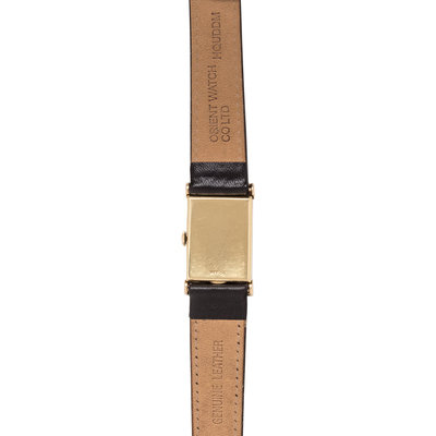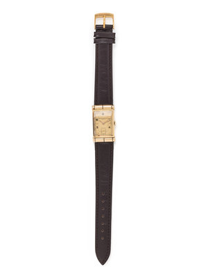 35.00 x 20.00 mm case dimensions inclusive of lugs, matte silvered dial, applied dot and Arabic numerals, subdial for seconds at 6 o'clock, 17 jewel manual wind movement signed LECOULTRE CO. SWISS, black leather strap, gold tone tang buckle. 6 1/8-7 1/2 inches long.