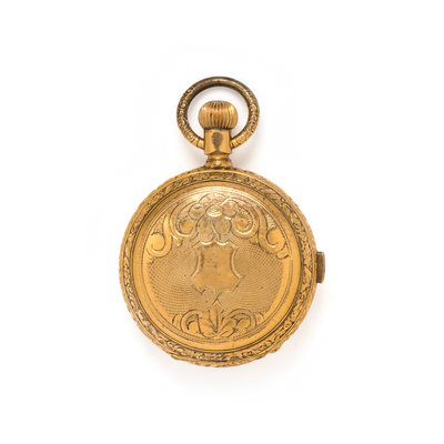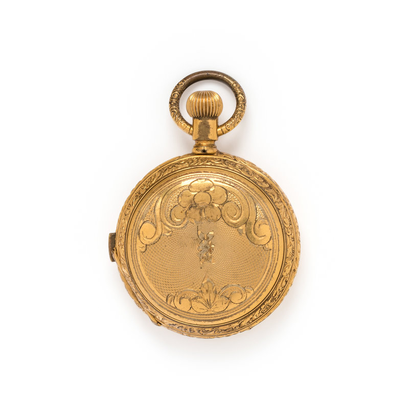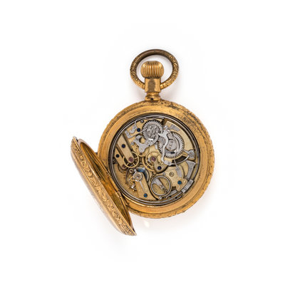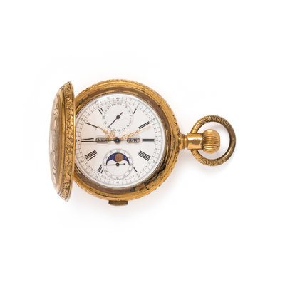 55.00 mm case diameter, white dial, black Roman numerals with outer chapter ring calibrated for minutes, subdial for seconds with moon phase at 6 o'clock, subdial for date at 12 o'clock, central apertures for day and month in French, stem wound lever set jeweled gilt movement with repeater function, engine turned and foliate engraved case with blank cartouche.
