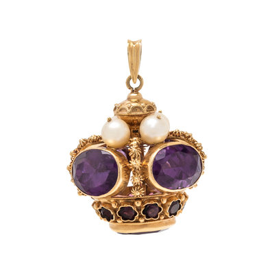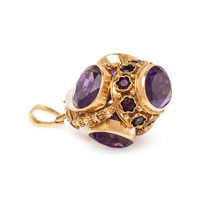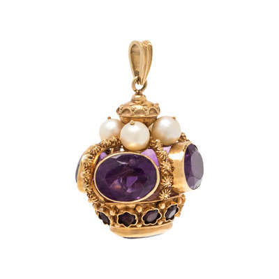 Containing five oval and 10 round mixed cut amethysts and four cultured pearls. Mounted in yellow gold. 1 3/4 inches long.