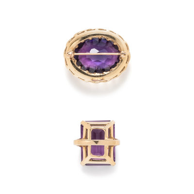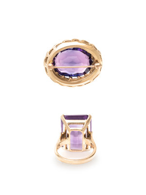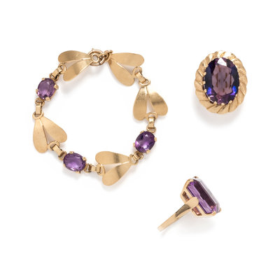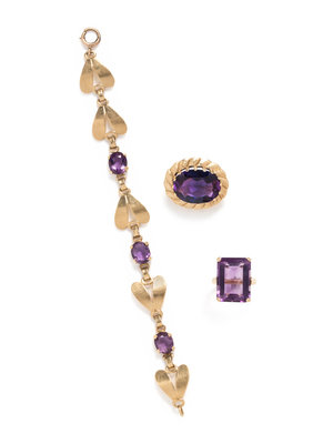 Consisting of a ring containing one emerald cut amethyst measuring approximately 18.85 x 14.35 x 8.85 mm, a brooch containing one oval mixed cut amethyst measuring approximately 20.30 x 15.00 x 6.30 mm, together with a bracelet containing three oval mixed cut amethysts. Ring size 5 1/2. Brooch: 1 1/16 inches x 7/8 inch. Bracelet: 6 3/4 inches long.
