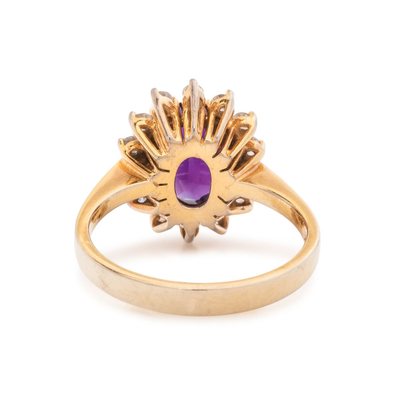 Containing one oval mixed cut amethyst measuring approximately 9.30 x 7.40 x 4.90 mm and 14 single cut diamonds. Mounted in yellow gold. Ring size 6.