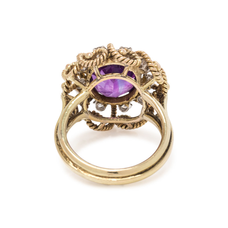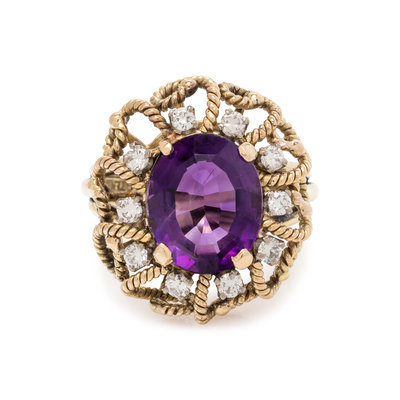 Containing one oval mixed cut amethyst measuring approximately 12.10 x 10.00 x 6.00 mm and 10 round brilliant cut diamonds. Mounted in yellow gold. Ring size 6 1/2.