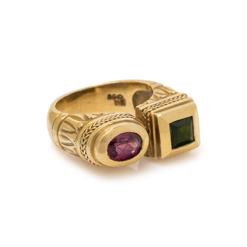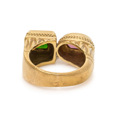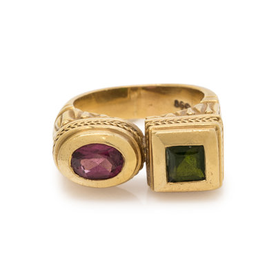 Consisting of an open ring containing one oval mixed cut pink tourmaline and one square step cut green tourmaline. Ring size 5 3/4.