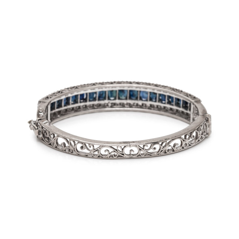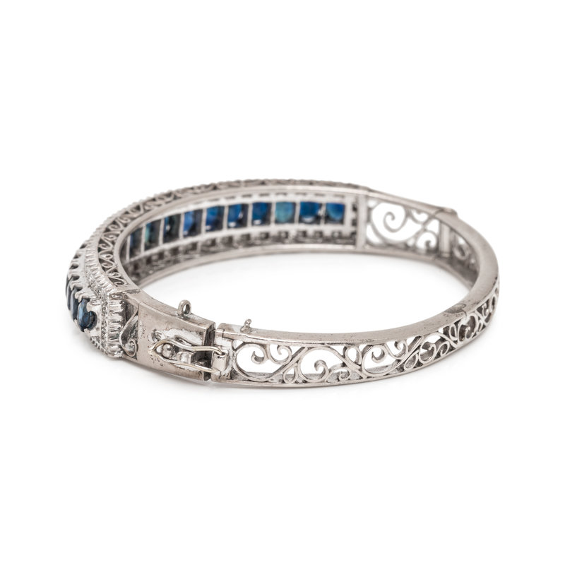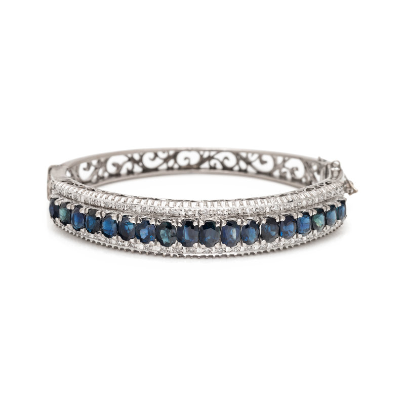 Containing 18 oval mixed cut synthetic sapphires and numerous single cut diamonds, hinged with side clasp, Mounted in white gold. 6 1/4 inches inner circumference.
