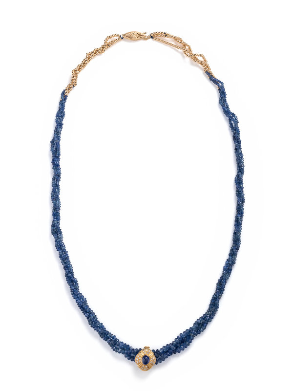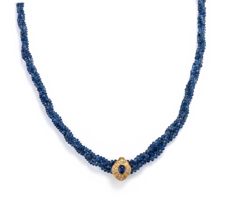 Consisting of three strands of faceted sapphire and yellow gold beads, with yellow gold clasp and removable enhancer containing one oval cabochon sapphire and 20 round brilliant cut diamonds. 22 inches long.