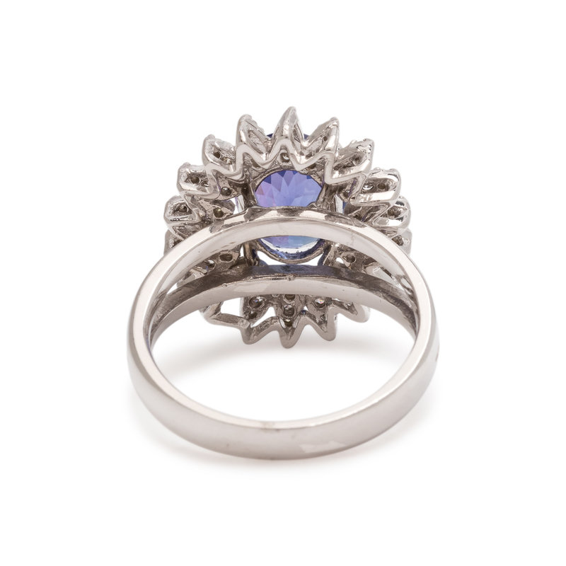 Containing one oval mixed cut tanzanite measuring approximately 9.30 x 7.65 x 5.30 mm and 54 round brilliant cut diamonds weighing approximately 0.30 carat total. Mounted in white gold. Ring size 7.