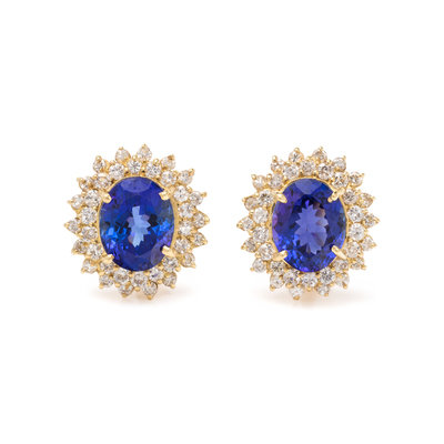 Containing two oval mixed cut tanzanites measuring approximately 12.20 x 9.50 mm and 72 round brilliant cut diamonds weighing approximately 1.80 carats total, posts with clip backs. 3/4 inch long.