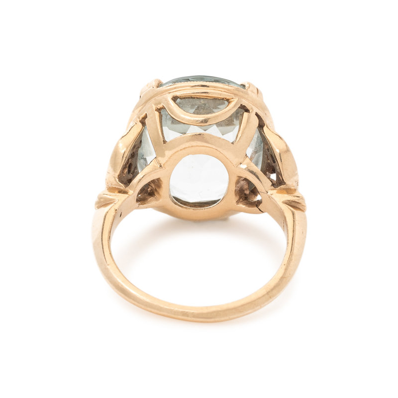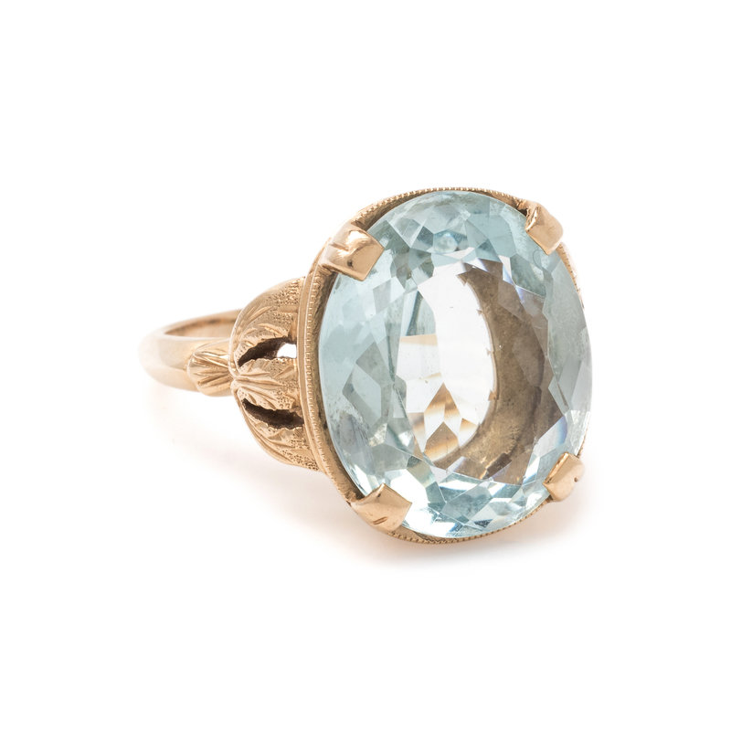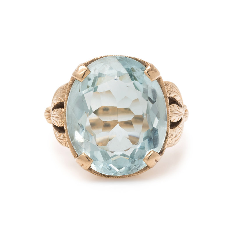 Containing one oval mixed cut aquamarine measuring approximately 16.05 x 13.50 x 7.10 mm. Ring size 5 1/2.