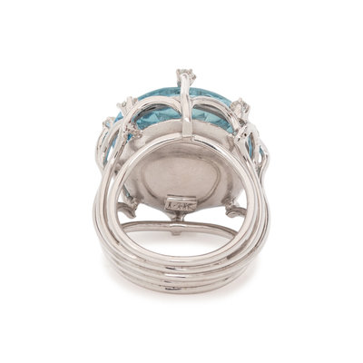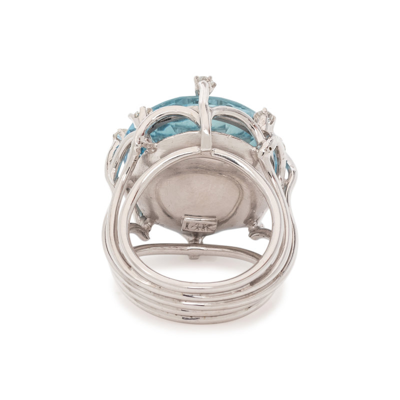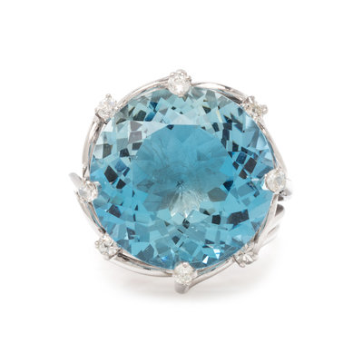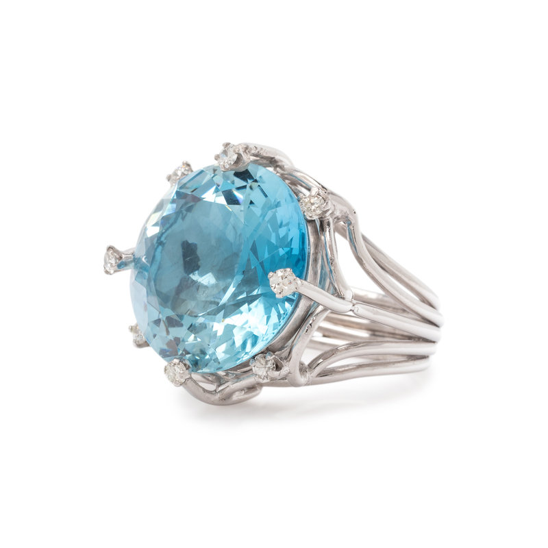 Containing one round mixed cut aquamarine measuring approximately 19.00 mm in diameter and eight round brilliant cut diamonds. Mounted in white gold. Ring size 6.