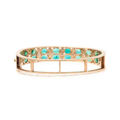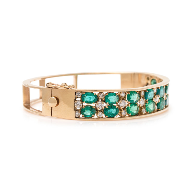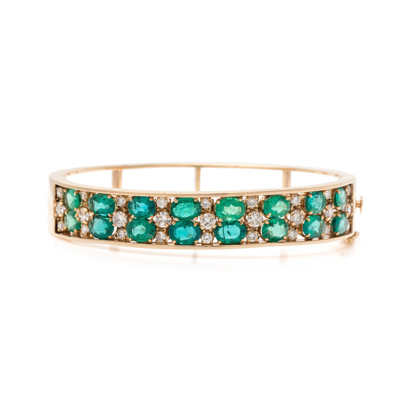 Containing 16 oval mixed cut synthetic emeralds and 27 round brilliant cut diamonds weighing approximately 1.15 carats total, hinged with side clasp. Mounted in yellow gold. 6 inches inner circumference.