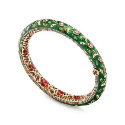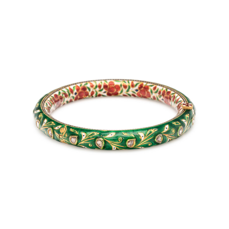In Mughal style, containing 18 mixed cut diamonds with polychrome enamel, hinged with screw down clasp. 7 inches inner circumference.
