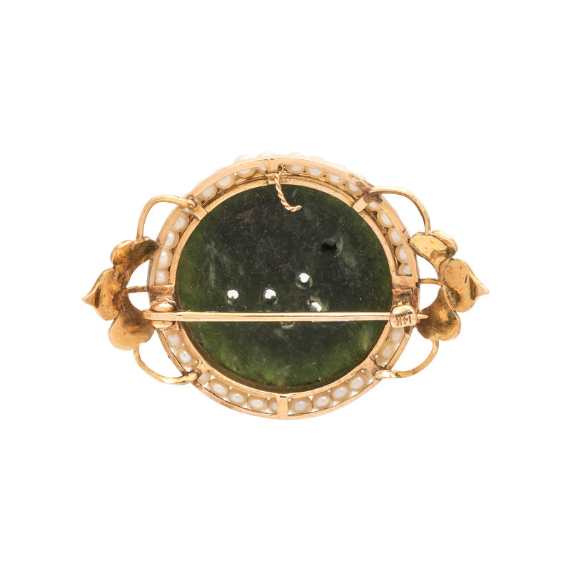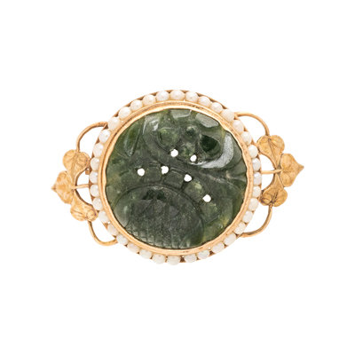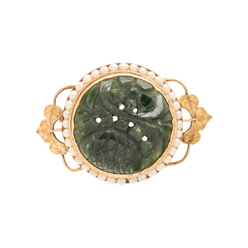 YELLOW GOLD, CARVED JADEITE AND SEED PEARL BROOCH