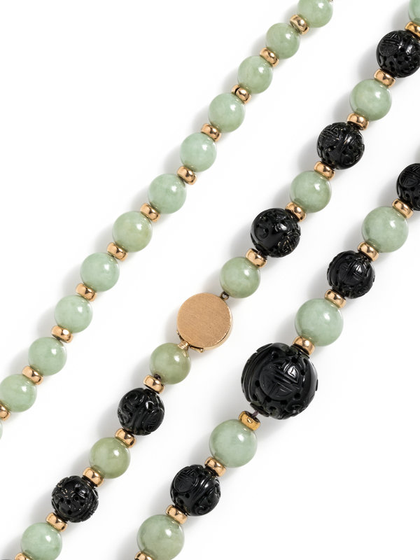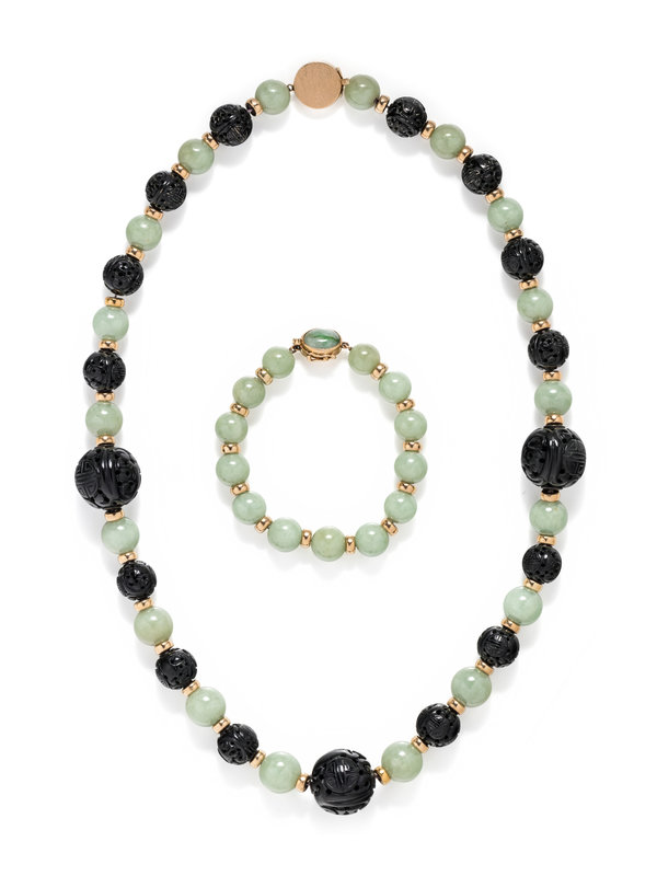Consisting of a necklace containing 18 jade beads and 17 carved black jade beads with yellow gold spacer beads and clasp, together with a bracelet containing 13 jade beads with yellow gold spacer beads and clasp. Necklace: 23 inches long. Bracelet: 7 1/2 inches long.