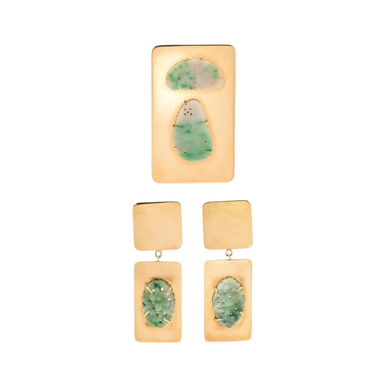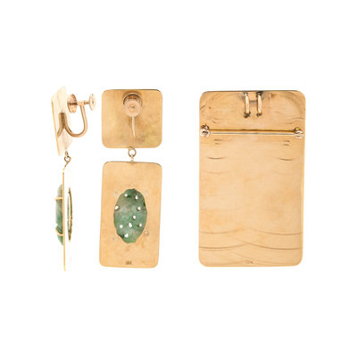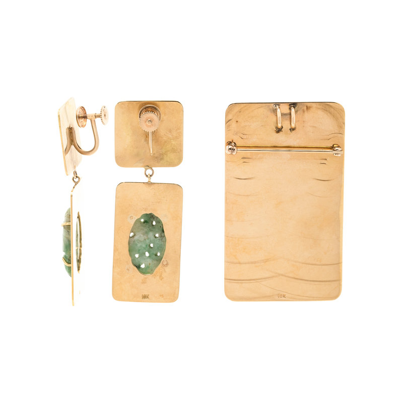 Consisting of a rectangular pendant/brooch containing two carved and pierced jade plaques, together with a pair of drop earclips containing two carved and pierced jade plaques. Pendant/brooch: 2 3/8 x 1 3/8 inches. Earclips: 2 3/8 inches long.