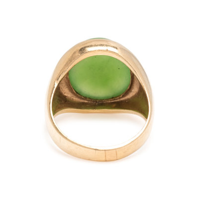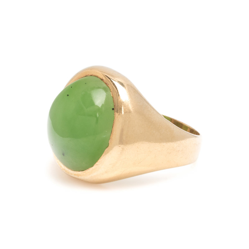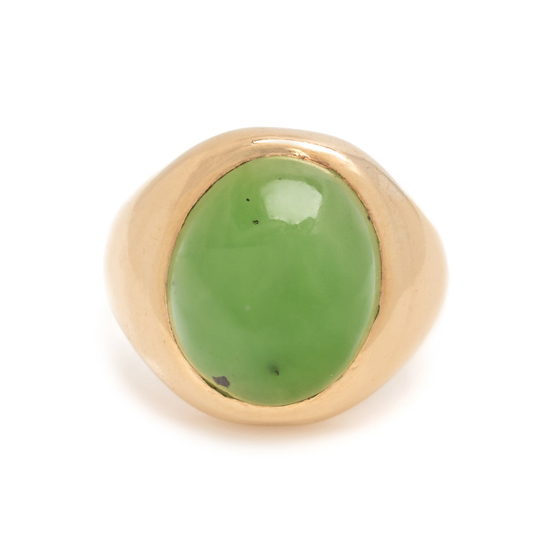 Containing one oval cabochon nephrite measuring approximately 15.95 x 13.60 x 6.20 mm. Ring size 9 1/4.