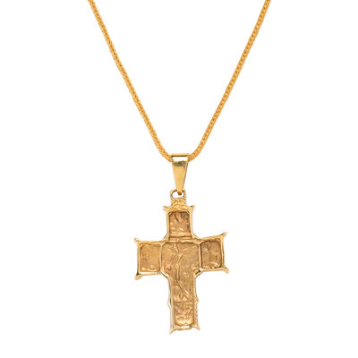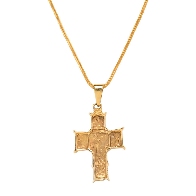 Consisting of a matte gold cross with figural scenes, suspended from a high karat gold foxtail chain. 18 inches long.
