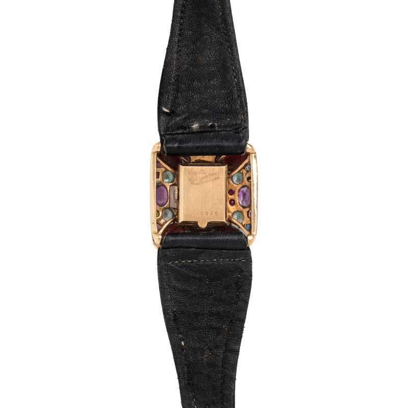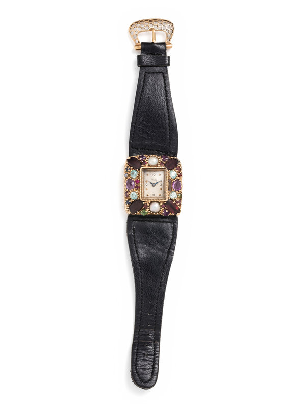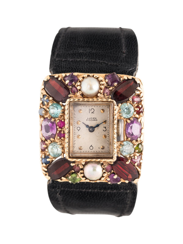 32.00 x 30.00 mm case dimensions, the bezel containing numerous mixed cut gemstones including garnet, amethyst and cultured pearls, matte silvered dial, applied gold dot numerals, 17 jewel manual wind movement signed FILS de R. PICCARD SWISS, black strap, yellow gold tang buckle. 5 3/8-6 1/2 inches long.