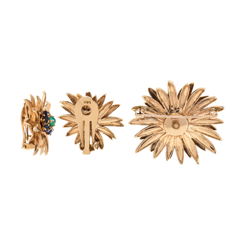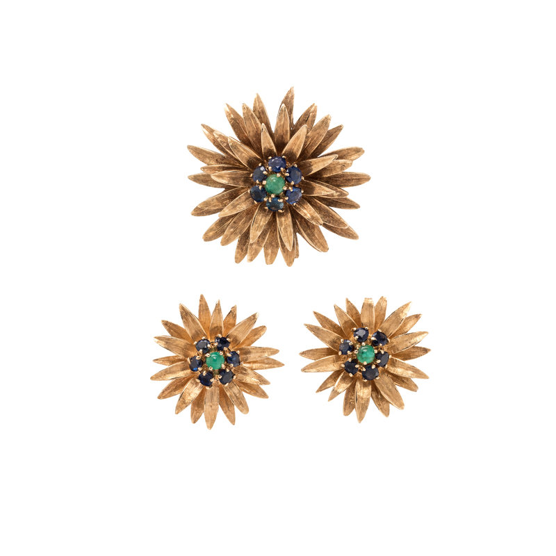 YELLOW GOLD, EMERALD AND SAPPHIRE FLOWER MOTIF SET